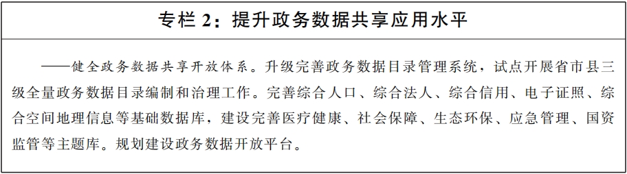 (三)健全政務數(shù)據(jù)共享體系。圍繞“高效辦成一件事”,推動以查詢、核驗、批量交換等多元化方式開展政務數(shù)據(jù)共享,建立跨層級、跨地域、跨系統(tǒng)、跨部門、跨業(yè)務政務數(shù)據(jù)共享和業(yè)務協(xié)同體系,擴大政務數(shù)據(jù)共享交換覆蓋范圍。升級完善省、市政務數(shù)據(jù)共享交換平臺,加速推進縣域政務數(shù)據(jù)匯集,強化國家、省、市三級政務數(shù)據(jù)共享交換平臺聯(lián)動,推進跨層級政務數(shù)據(jù)回流。建立跨系統(tǒng)信息共享機制,推動省級部門信息系統(tǒng)和省數(shù)據(jù)共享交換平臺數(shù)據(jù)庫互通共享。推動主動共享與按需共享相結合,定期發(fā)布政務數(shù)據(jù)共享責任清單。