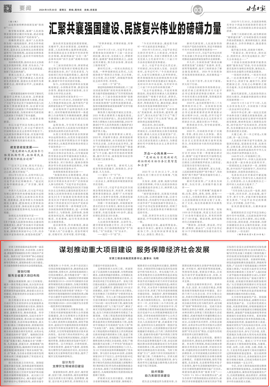 今后,甘肅工程咨詢集團將完整準確全面貫徹新發(fā)展理念,主動服務(wù)和融入新發(fā)展格局,聚焦培育發(fā)展新質(zhì)生產(chǎn)力,以高質(zhì)量規(guī)劃、高品質(zhì)設(shè)計、高效能服務(wù),在奮力譜寫中國式現(xiàn)代化甘肅篇章中作出新的更大貢獻。