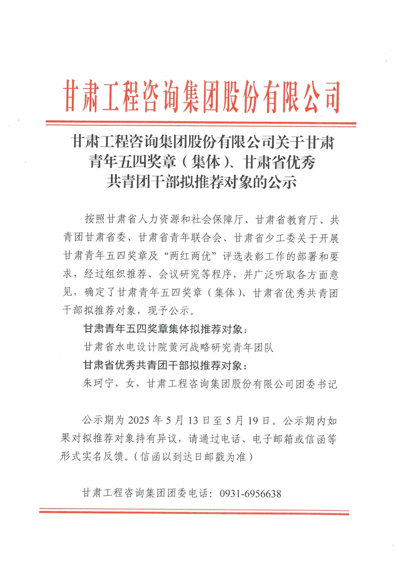 甘肅工程咨詢集團股份有限公司關于甘肅青年五四獎章(集體)、甘肅省優(yōu)秀共青團干部擬推薦對象的公示