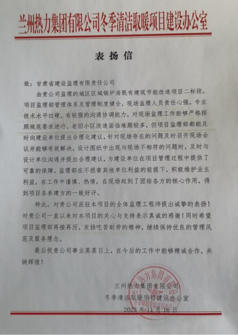 近日,省建設(shè)監(jiān)理公司收到蘭州熱力集團有限公司冬季清潔取暖項目建設(shè)辦公室發(fā)來的表揚信,對省建設(shè)監(jiān)理公司城區(qū)區(qū)域鍋爐房既有建筑節(jié)能改造項目二標(biāo)段監(jiān)理部全體人員表示感謝。