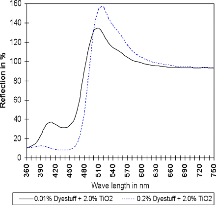 DE ≤ 1.0 (tested in GP-PS with 2.0% TiO2 and 0.2% dyestuff; CIELab; DIN 6174) |