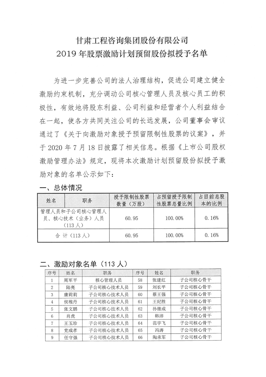 2019年股票激勵(lì)計(jì)劃預(yù)留股份擬授予名單