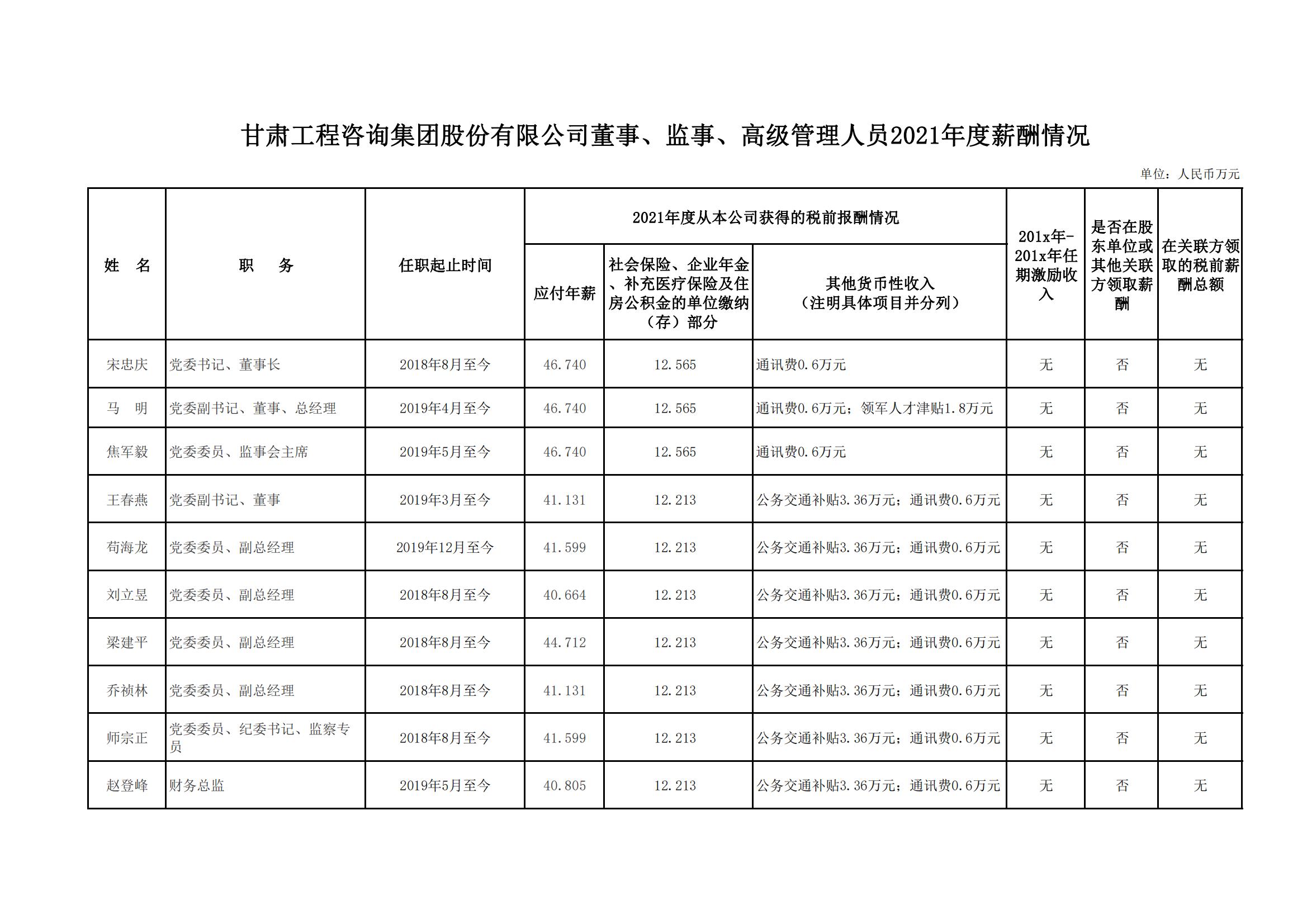 甘肅工程咨詢集團股份有限公司董事、監(jiān)事、高級管理人員2021年度薪酬公示