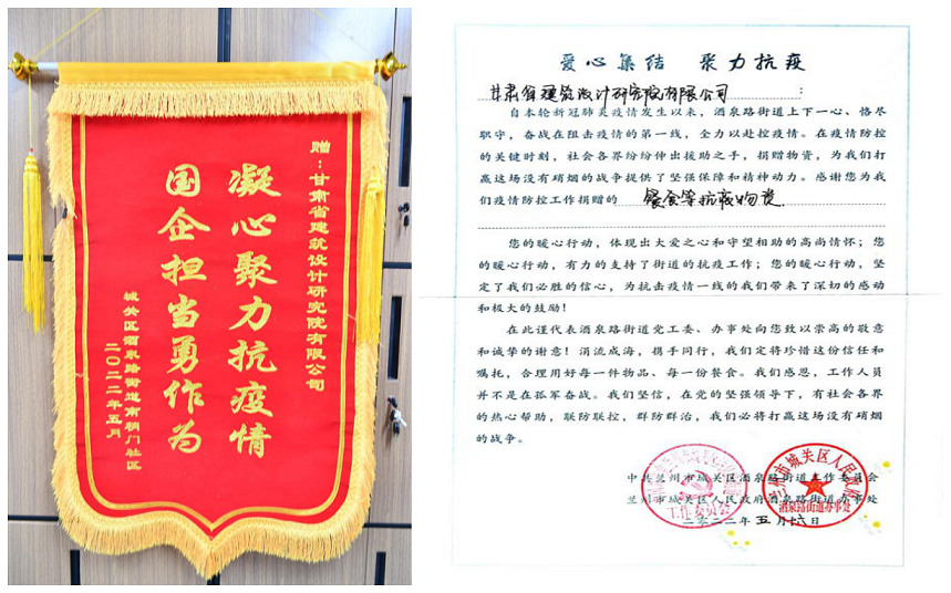 5月16日,甘肅省建筑設(shè)計(jì)研究院有限公司收到了來(lái)自蘭州市城關(guān)區(qū)酒泉路街道送來(lái)的感謝錦旗,錦旗上書寫著“凝心聚力抗疫情 國(guó)企擔(dān)當(dāng)勇作為”。建筑設(shè)計(jì)院黨委書記李向軍、總經(jīng)理曹慶、紀(jì)委書記丁永升及黨群工作部相關(guān)負(fù)責(zé)人接待來(lái)訪。