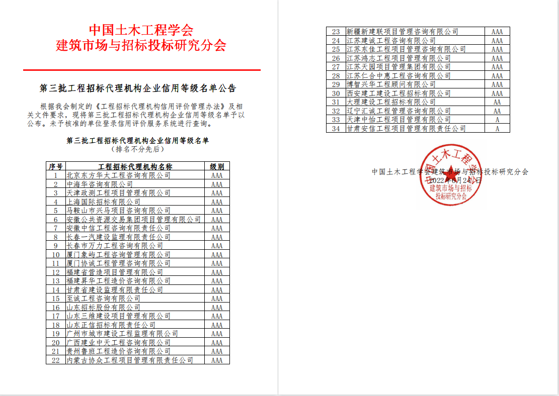 為認(rèn)真貫徹落實(shí)甘肅省第十四次黨代會(huì)精神,更好地發(fā)展招標(biāo)代理業(yè)務(wù),努力推進(jìn)企業(yè)高質(zhì)量發(fā)展,2022年6月,甘肅省建設(shè)監(jiān)理有限責(zé)任公司積極籌備參加了由中國(guó)土木工程學(xué)會(huì)建筑市場(chǎng)與招投標(biāo)研究分會(huì)組織的招標(biāo)代理機(jī)構(gòu)信用評(píng)價(jià),日前,第三批工程招標(biāo)代理機(jī)構(gòu)企業(yè)信用等級(jí)名單公布,建設(shè)監(jiān)理公司榮獲中國(guó)土木工程學(xué)會(huì)建筑市場(chǎng)與招標(biāo)投標(biāo)研究分會(huì)招標(biāo)代理機(jī)構(gòu)AAA級(jí)信用企業(yè)稱(chēng)號(hào)。
