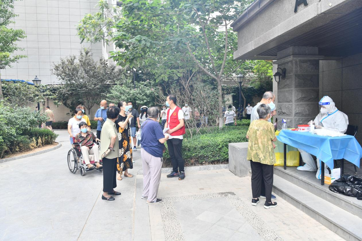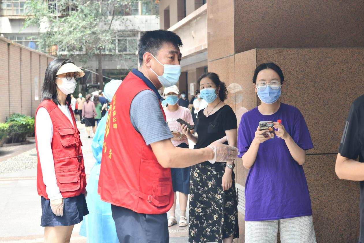 中午時(shí)分,志愿者們頂著38℃的高溫,穿梭在小區(qū)核酸檢測(cè)采集現(xiàn)場(chǎng)、小區(qū)出入口,按照核酸檢測(cè)要求,引導(dǎo)待測(cè)人員佩戴好口罩、保持安全距離、有序排隊(duì)。他們嗓子啞了也顧不上喝一口水,身上的衣服已不知被汗水浸濕了多少次,卻始終沒有一個(gè)人叫苦叫累,依然努力奮戰(zhàn)在核酸采樣第一線,用實(shí)際行動(dòng)展示“奉獻(xiàn)、友愛、互助、進(jìn)步”的志愿精神,詮釋國(guó)企擔(dān)當(dāng)。