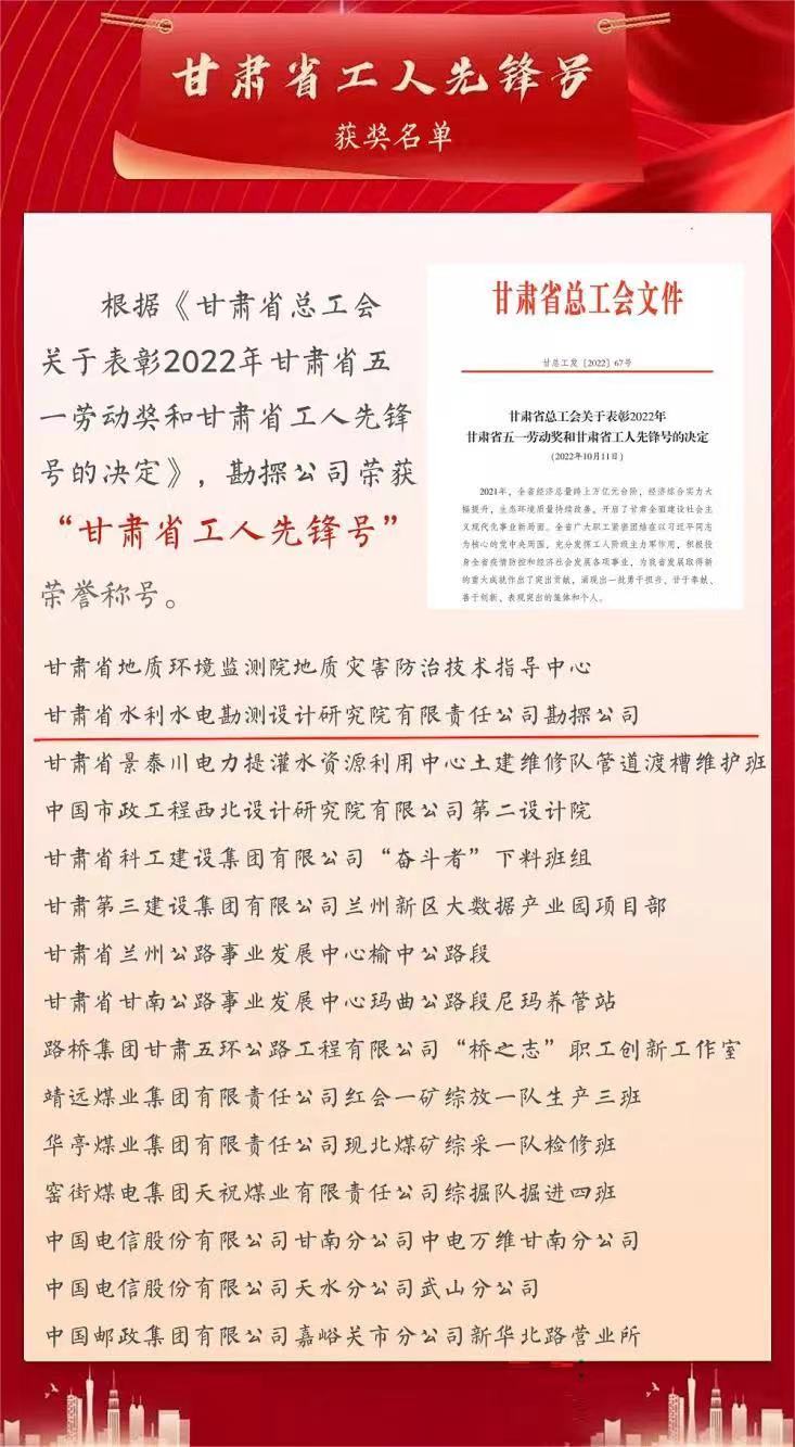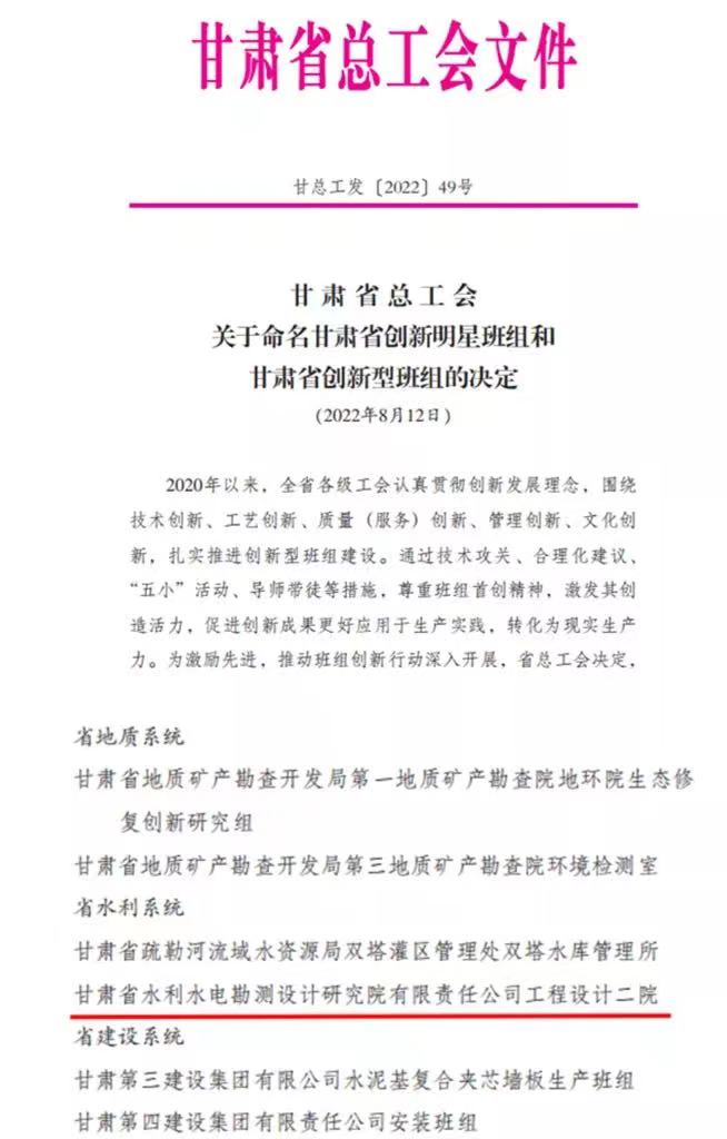 近日,甘肅省總工會發(fā)布2022年度“甘肅省工人先鋒號”和“甘肅省創(chuàng)新型班組”名單,甘肅省水電設(shè)計院的勘探公司榮獲2022年度“甘肅省工人先鋒號”稱號,工程設(shè)計二院榮獲“甘肅省創(chuàng)新型班組”榮譽稱號。