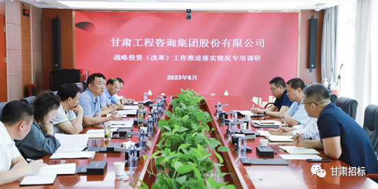 6月13日,甘肅工程咨詢集團(tuán)黨委委員、副總經(jīng)理劉立昱,董事會(huì)秘書柳雷,戰(zhàn)略投資部(改革辦)部長(zhǎng)馬靈會(huì)一行到招標(biāo)咨詢集團(tuán)對(duì)戰(zhàn)略投資(改革)工作推進(jìn)落實(shí)情況、董事會(huì)建設(shè)和運(yùn)行情況開展專項(xiàng)調(diào)研。