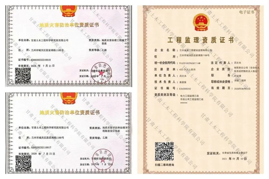 近期,土木工程院申報的地質(zhì)災害評估和治理工程勘查設計乙級、地質(zhì)災害治理工程施工乙級兩項資質(zhì)獲省自然資源廳批準。土木工程院全資子公司蘭州金建工程建設監(jiān)理有限公司申報的電力工程監(jiān)理乙級資質(zhì)也順利通過省住房和城鄉(xiāng)建設廳審批。